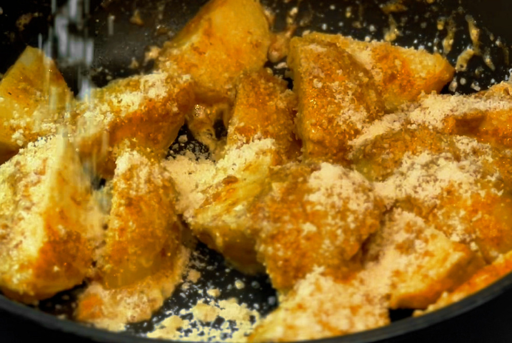 5、接著加入鹽巴和起司粉拌勻,讓馬鈴薯塊均勻裹上粉料,煎到焦香上色即可出鍋。