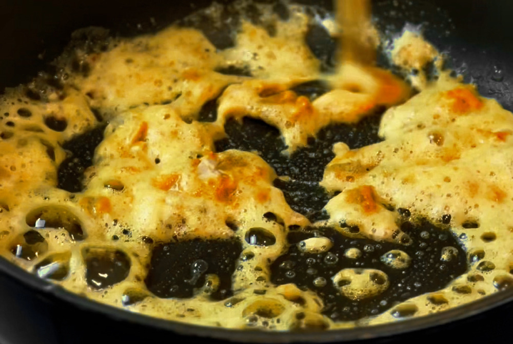 3、鍋中倒入橄欖油,加入鹹蛋黃,攪拌加熱到起泡沫。