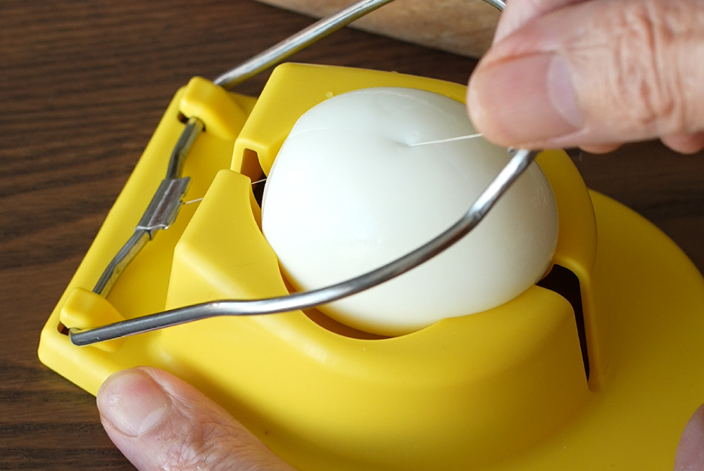 2、將煮好的雞蛋泡冷水剝殼,對切成半。