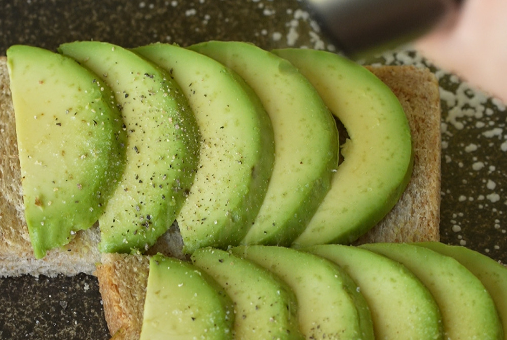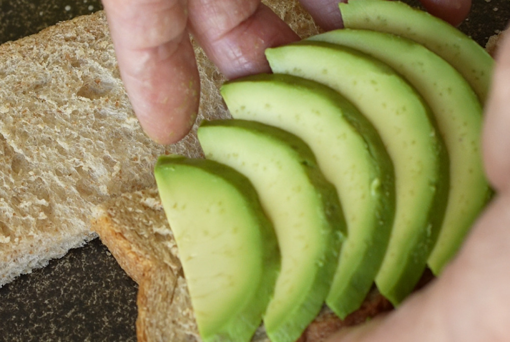 3、 將酪梨切片,鋪在烤過的全麥吐司上。