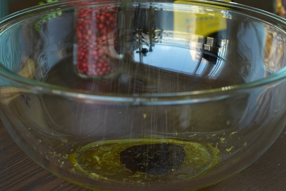 3、容器裡倒入頂級冷壓初榨橄欖油、巴薩米克醋、檸檬汁、地中海松露鹽和黑胡椒。