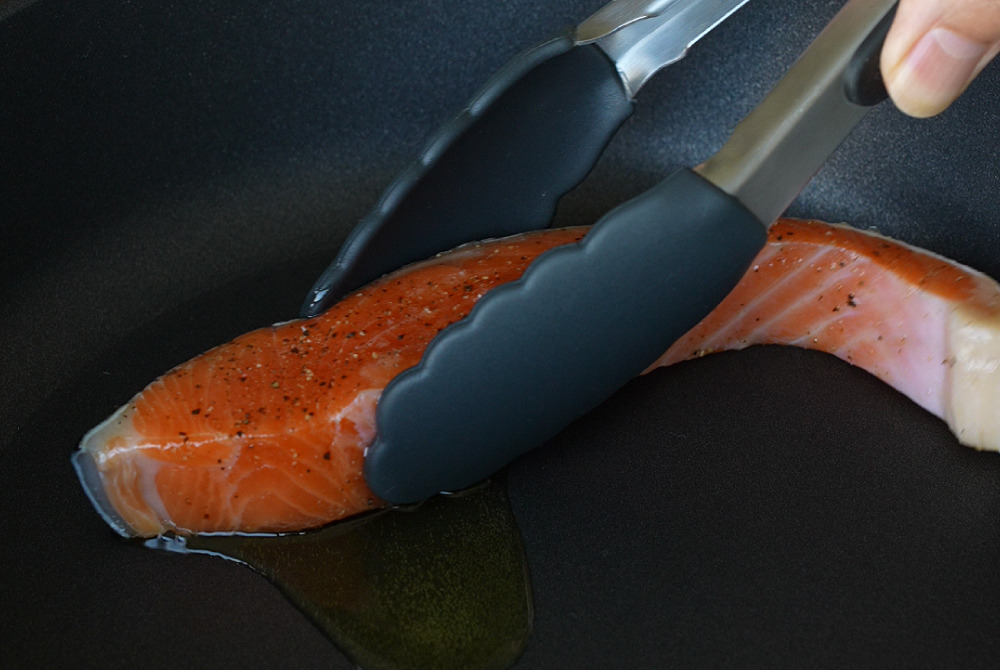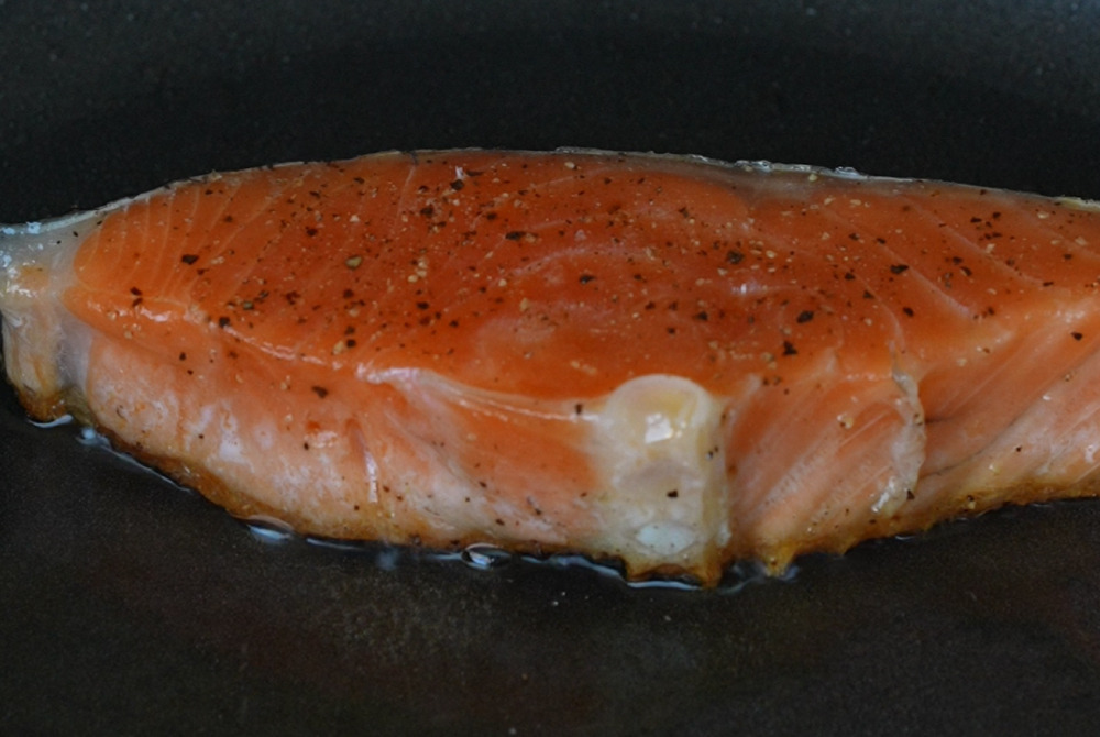 6、平底鍋倒入頂級冷壓初榨橄欖油,放入鮭魚油煎。
