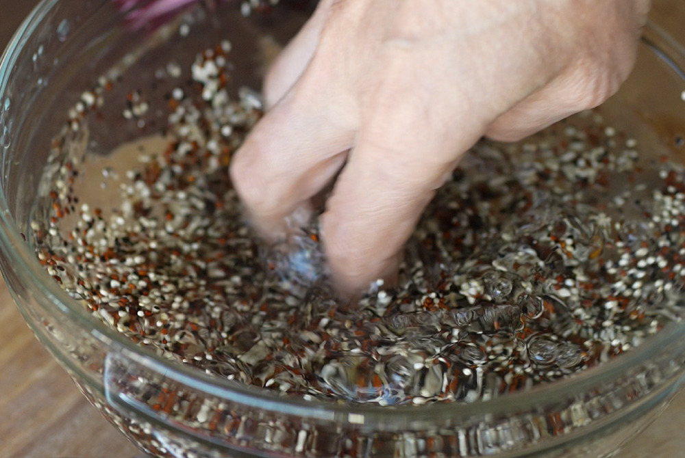 1、冷水沖洗藜麥2~3次,放入電鍋蒸煮,煮好再燜5~10分鐘,備用。