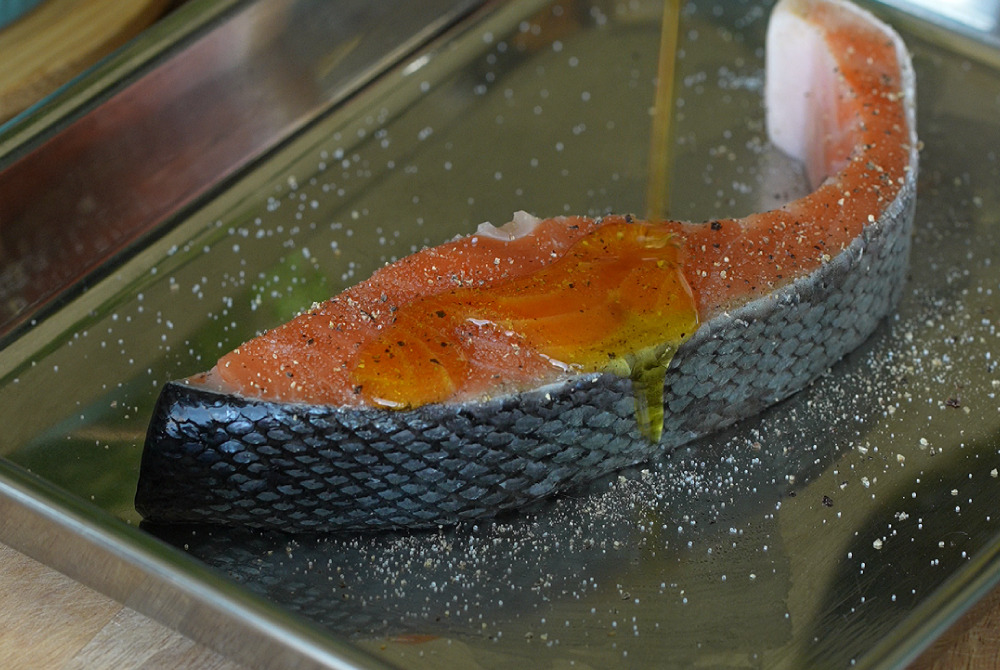 5、鮭魚抹上少許松露鹽、黑胡椒和頂級冷壓初榨橄欖油,輕拍按摩入味。