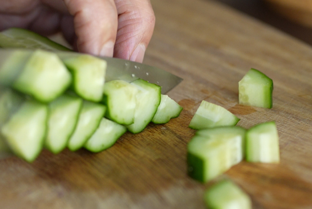 2、洋蔥、小黃瓜,小番茄切丁,備用。