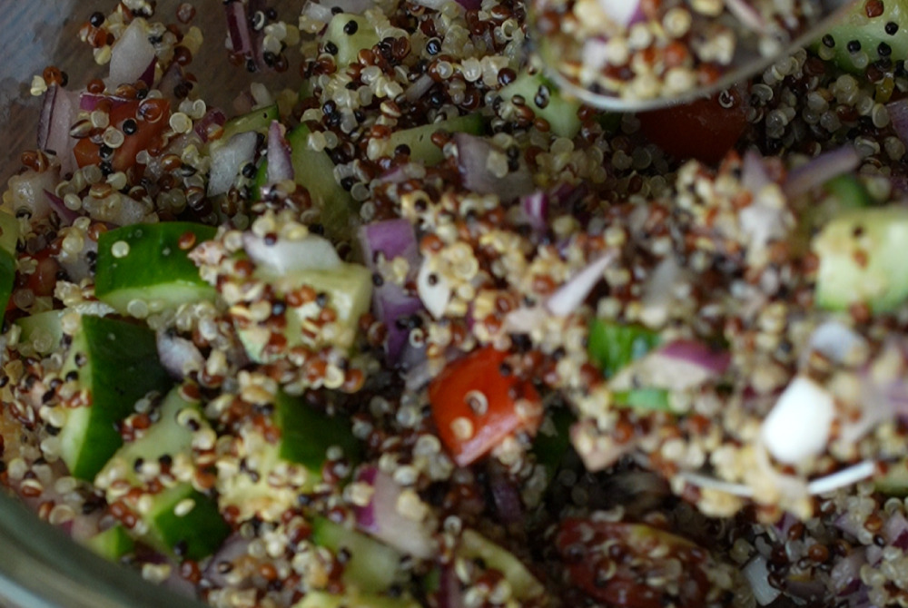 4、再放入洋蔥丁、藜麥、小黃瓜丁、小番茄丁,充分拌勻。藜麥沙拉完成~!!