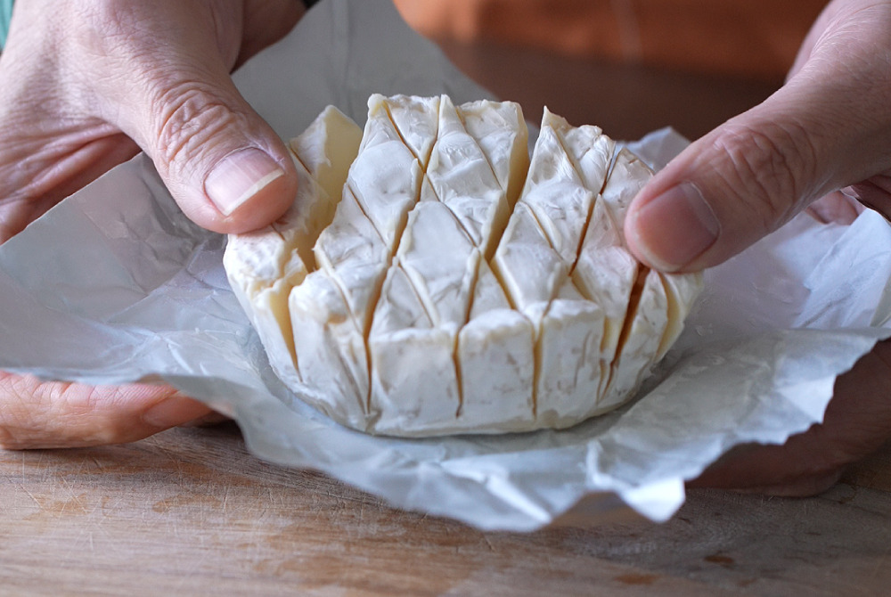 2、布里起司表面劃出菱格紋,盡量切到底,但不要完全切斷。