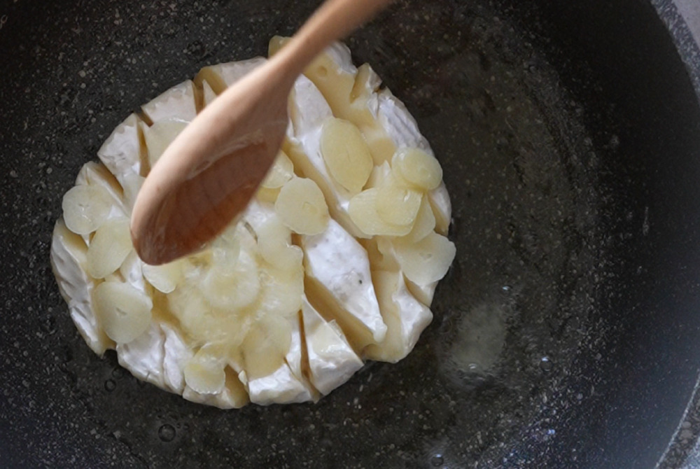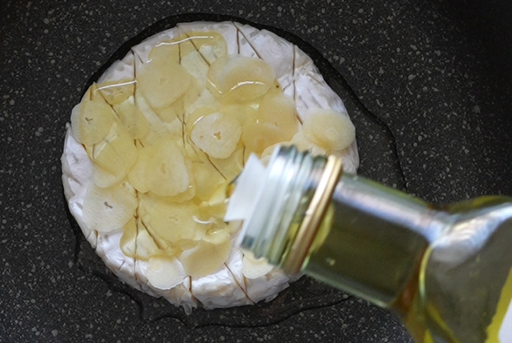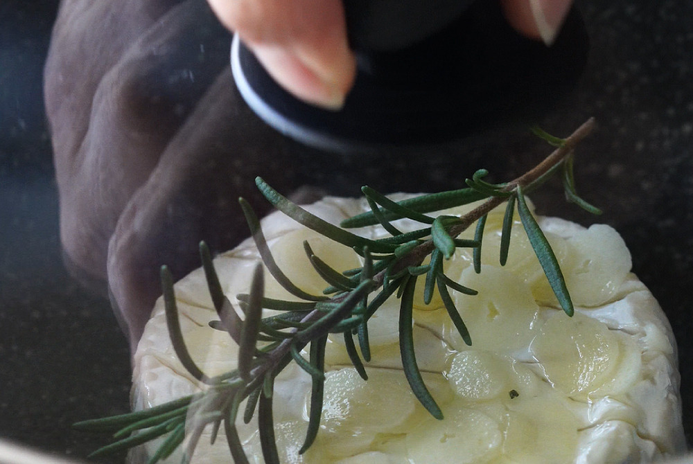 3、不沾鍋倒入約1湯匙松露橄欖油,放入布里起司,鋪上蒜片,再淋上1湯匙松露橄欖油,撒上迷迭香與少許黑胡椒。