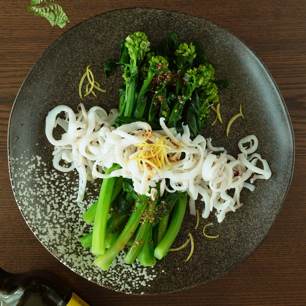 5、將青花筍、花枝薄片盛盤,淋上特製橄欖醬料,最再撒上一些檸檬皮屑,完成!