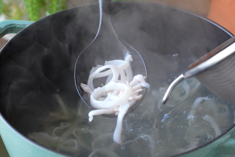 3、將花枝放入滾水中川燙約20~30秒,直到變白後,立刻撈起泡冰水約1~2分鐘,瀝乾備用。