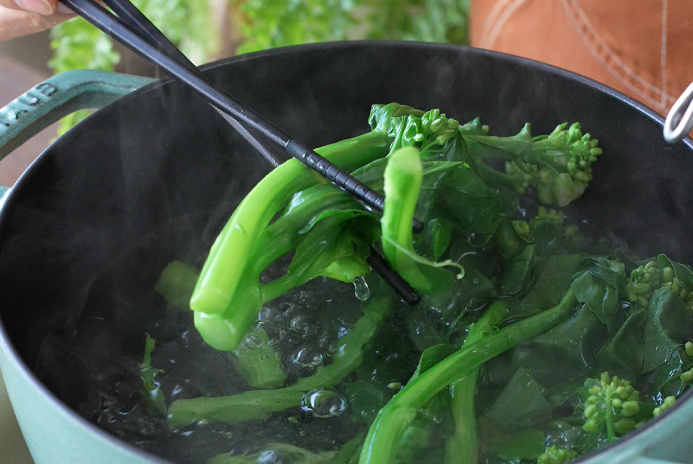 2、將青花筍放入沸水中,加少許鹽煮至軟熟後,撈出放入冷水中,擠乾水分,切段備用。