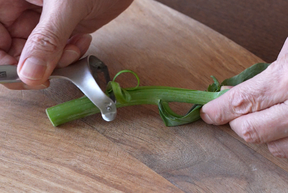 1、將青花筍去皮,花枝切薄片,檸檬皮屑切絲,備用。