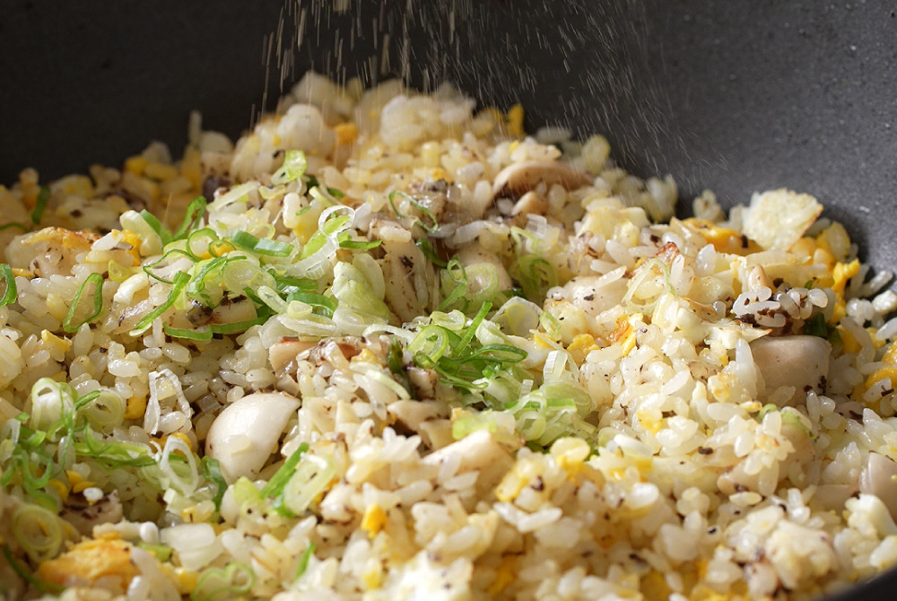8、最後再淋上松露橄欖油,撒上黑胡椒,加入剩下的蔥花,快速翻炒拌勻。