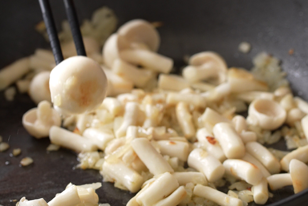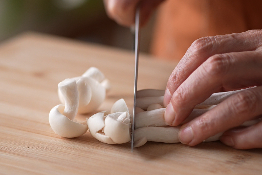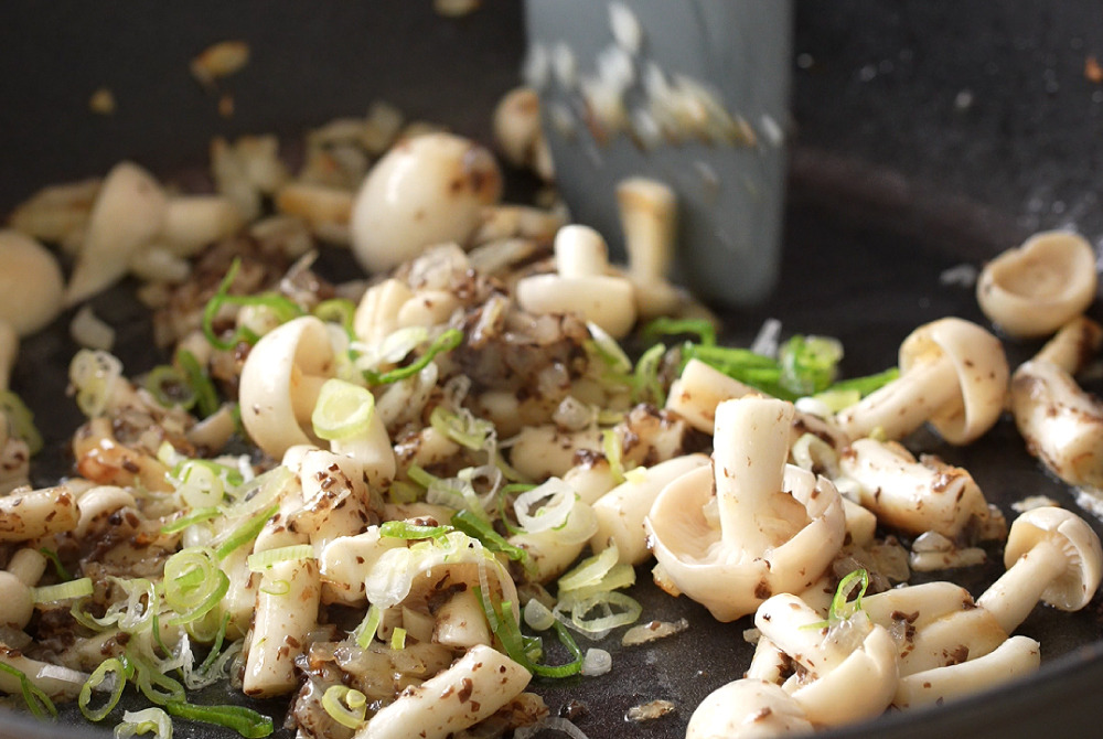 3、加入雪白菇炒至微微上色、釋出水氣。