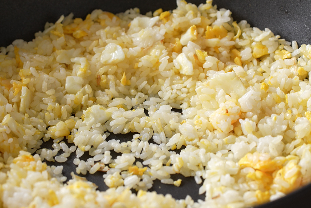 6、放入白飯,用鍋鏟從中心向外切拌,讓蛋液均勻包裹米粒,轉中火翻炒,至飯粒乾爽分明。