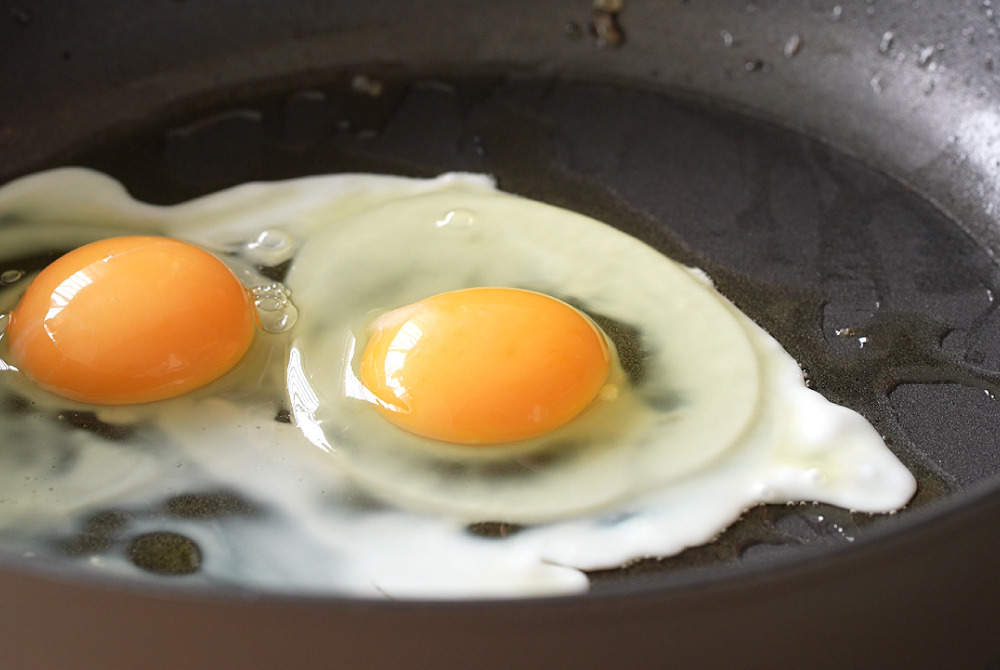 5、同鍋轉小火,加少許橄欖油,打入雞蛋,不要立刻翻動,等底部約3成熟。