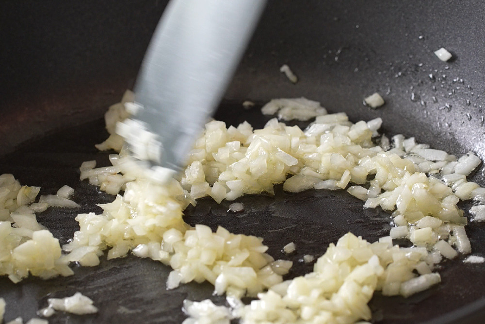 2、平底鍋加少許橄欖油,開中火,放入洋蔥炒至半透明。